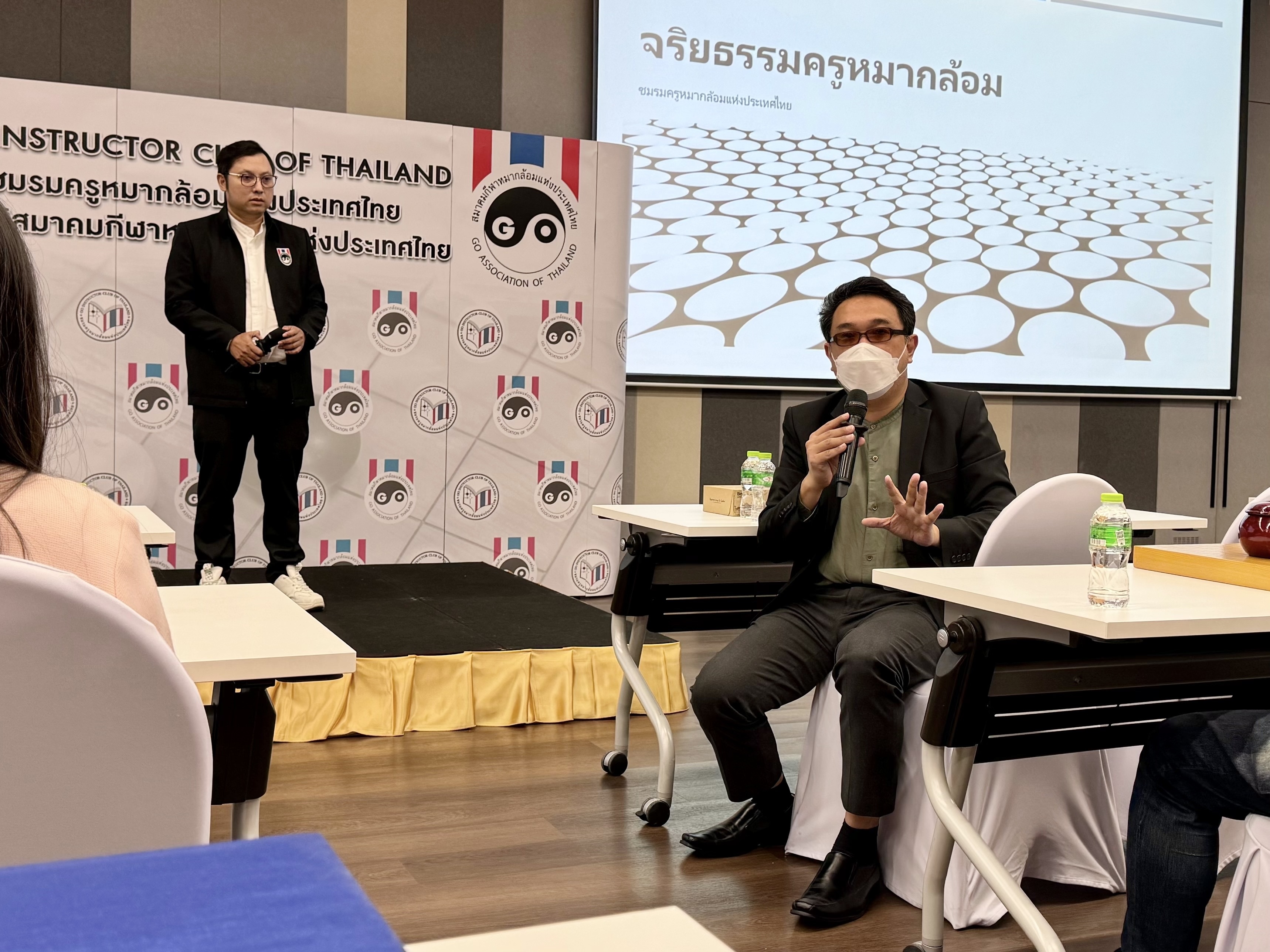 ในการนี้ คุณสัจจา ชัยภิบาล ประธานชมรมครูหมากล้อมแห่งประเทศไทย กล่าวถึงความเป็นมาของโครงการ, คุณนพเมศฐ์ สุวรรณนามัย โค้ชระดับผู้บริหารและที่ปรึกษาด้านกลยุทธ์ แบ่งปันเรื่องการโค้ชและจิตวิทยาการสอนหมากล้อม, คุณรัชชยุต ภูวัชร์เตชากร ที่ปรึกษาสมาคมกีฬาหมากล้อมฯ และคุณหัสดินทร์ เอกสิงหชัย กรรมการกองทุนหมากล้อม แบ่งปันเรื่องจริยธรรมครูหมากล้อม, ดร.มติ ทาเจริญศักดิ์ รองประธานชมรมครูหมากล้อมฯ และผู้ช่วยศาสตราจารย์ ลภณ จิรโศภิณ กรรมการบริหารชมรมครูหมากล้อมฯ แบ่งปันเรื่องการออกแบบหลักสูตรหมากล้อมสำหรับสถาบันการศึกษา